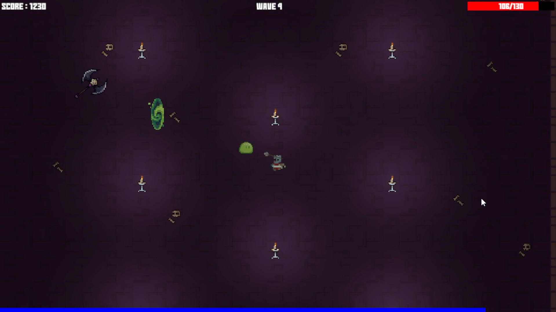 C'est un jeu dans lequel vous incarnez un petit personnage en armure, vous êtes bloqué dans une grande pièce d'un donjon et vous devez faire face à des vagues de monstres de plus en plus puissants.